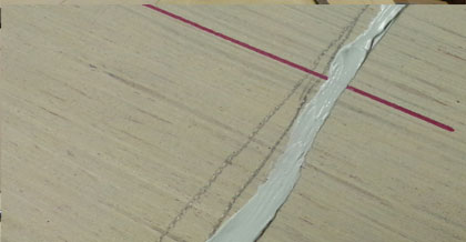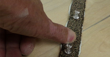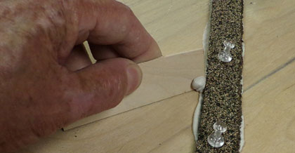Tools needed to lay the cork roadbed, liquid nail, claking gun, utility knife, push pins and a small hammer. Here I started laying the outside half of the cork. First spread some liquid nail on the outside of the center line, smooth it out some. Lay the cork square side on the center line with the beveled side going out. Add the push pins to hold the cork in place and scrape away the excess liquid nail at the center line. Just smooth out any small amount of liquid nail on the bevel side with your finger, scrape away any large amount.