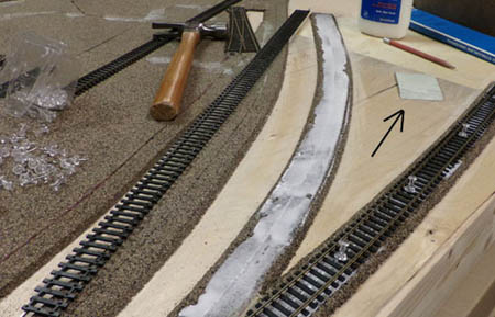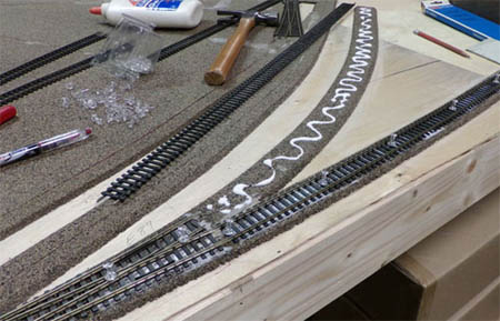Below I am gluing the track to the cork road bed with Elmer's white glue. Right photo shows a plastic spreader used to smooth out the glue.