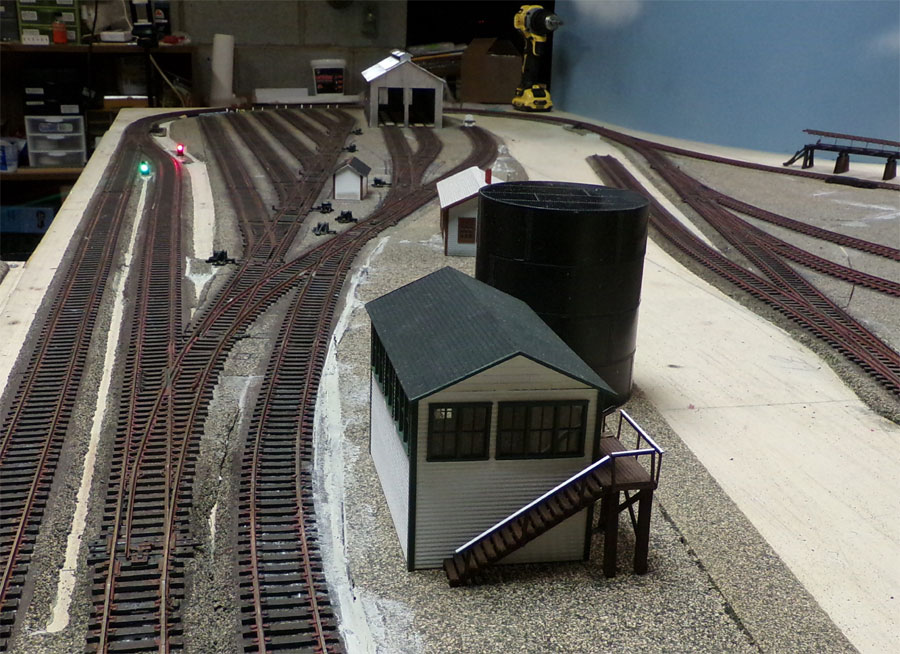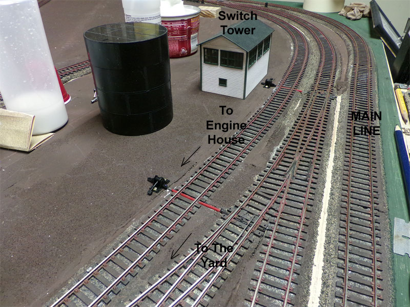 Next was to complete the dwarf signals on 3 of the switches. There are one set of dwarf signals on the left and 3 sets of dwarf signals on the right. There is one set of dwarf signals on one ground throw switch and the other 2 sets of dwarf signals are on the 2 switch machine switches. Switch Tower View: Standing in front of the switch tower looking left, you can view the yard also the left switch machine and dwarf signal. Looking to the right from the switch tower, you can view the the other switch machines and dwarf signals. The switch tower controls the switch machines on the main line going in and out of the yard.