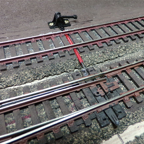 The last 2 ground throw for the switches were added at the Switch Tower. When you can't put a switch machine or switch ground throw beside a switch, there are other ways to fix this. I had to do 2 like this. No room underneath. The fun part was cutting the knob off flush and drilling a hole in it so the bent up wire can go in from underneath.