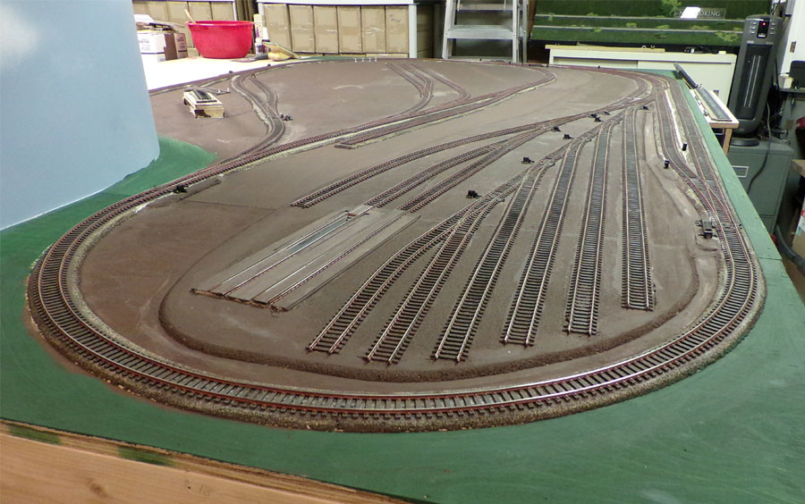 This layout was built with no space underneath for any switch machines so all the track work was laid and the DCC wiring was done first. Now it is time to install the 4 side mounted switch machines, make a control panel for the switches. My first time installing these Peco PL-11 side mounted switch machines. I finally got the diagram correct using my own toggle switches. From the original more cork road roadbed was added beside the track for the oil tank and switch tower. Now the land area platform is even with the track roadbed in the above 2 photos. Below Photo: On Dec. 7, 2021 I got it all painted, the basic. Now to start ballasting the yard first and maybe the main line circle around the yard. I will make a few ballast samples first before ballasting the layout yard. The top left sky base will have different shades of shrubs and so on. The green area will have different shades of green turf and shrubs. Shrubs will go along the bottom of the sky backdrop.
