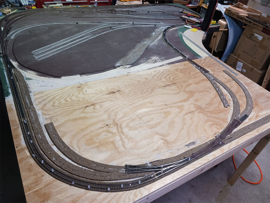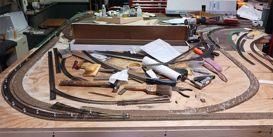 The above photo shows the new main line cork roadbed being added. Liquid nail is used under the cork roadbed and push pins used to hold it in place till it dries. The below photo shows all the cork roadbed completed, next I start laying all the track. This is glued down using Elmer's liquid white glue.