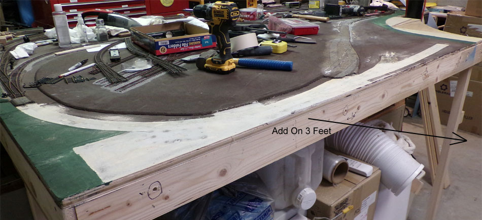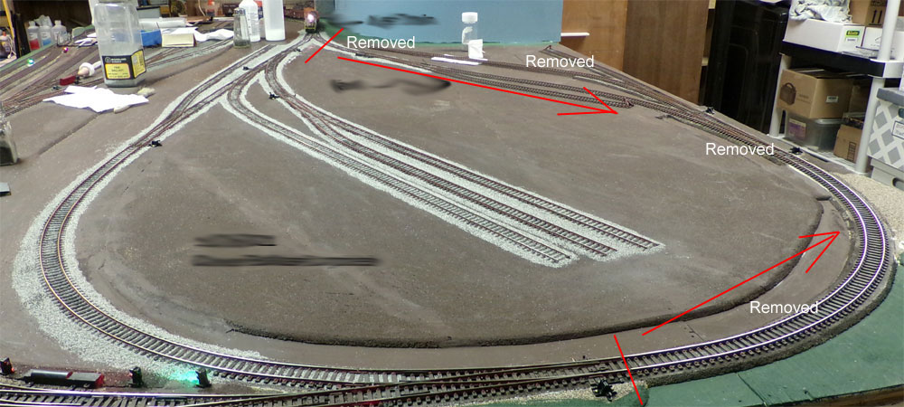 First off I had to remove the lower section of track and roadbed and add 3 X 6 section. The second below photo shows the lower track section removed.